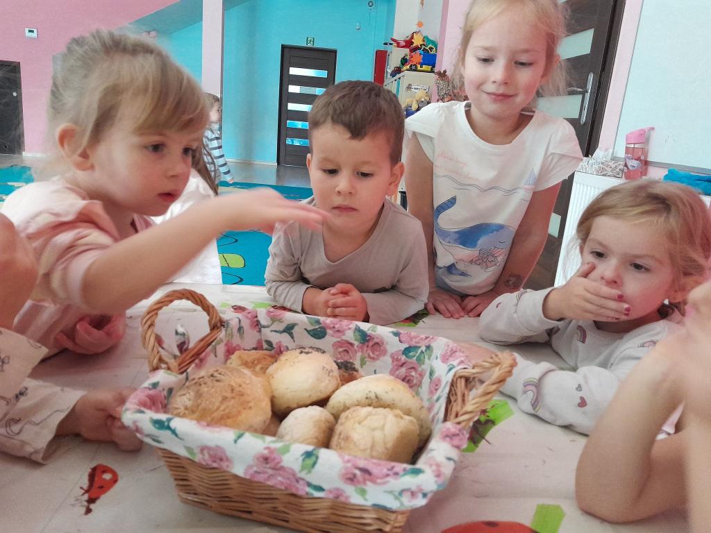 Dzieci podczas zajęć obchodziły DZIEŃ CHLEBA . Na początku poznaliśmy historyjkę obrazkową a następnie dowiedzieliśmy się jak wygląda zawód piekarza.Na zakończenie zjedliśmy chlebek z masełkiem oraz wykonaliśmy pracę plastyczną.